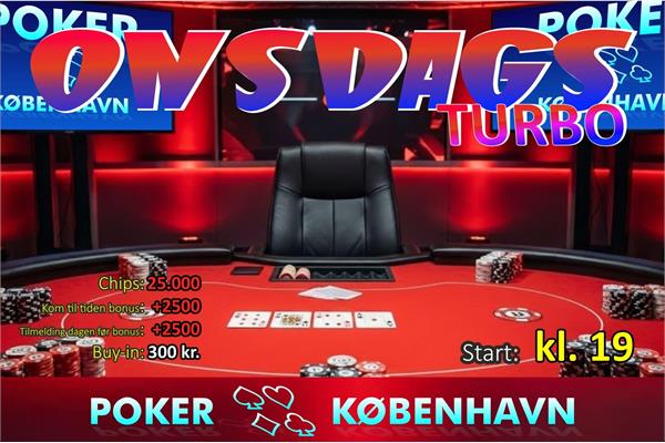 Vi spiller 9 mands borde på 6 borde (Max. 54 spillere) med levels på 20 minutter. Big Blind Ante fra Level 4